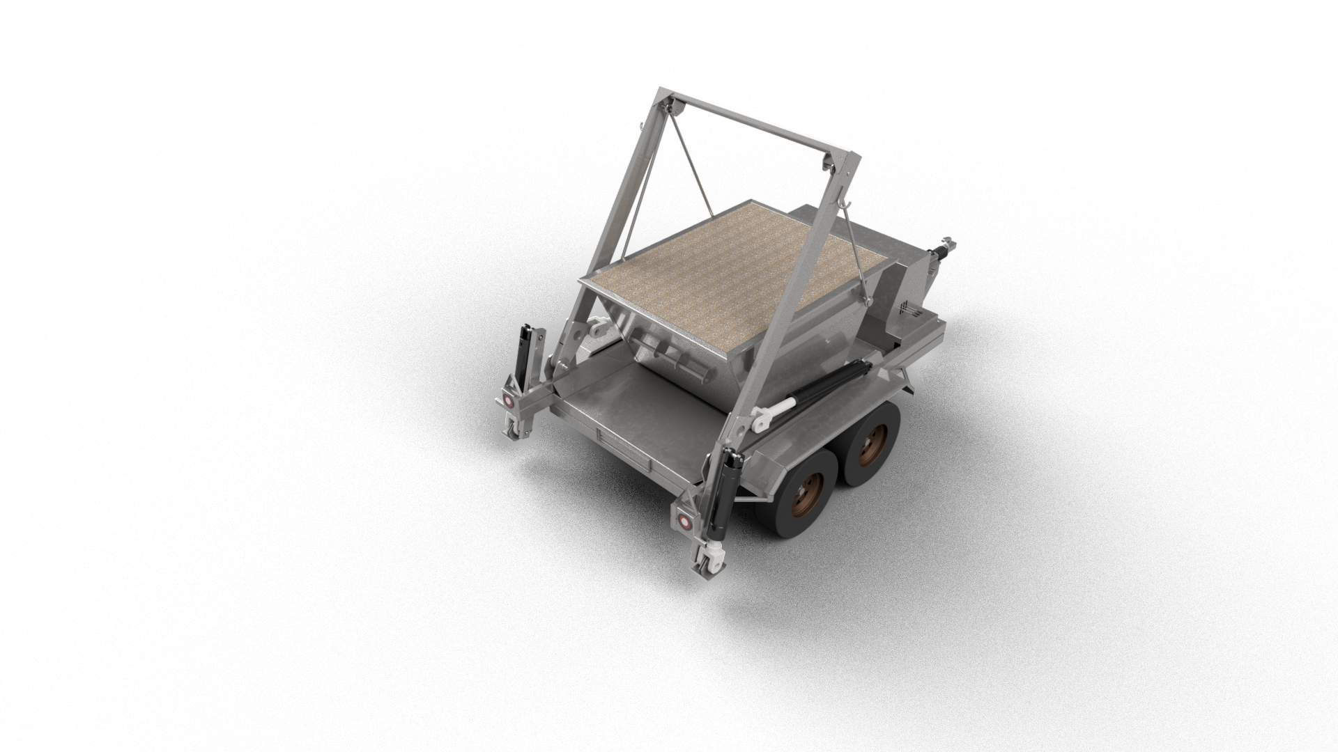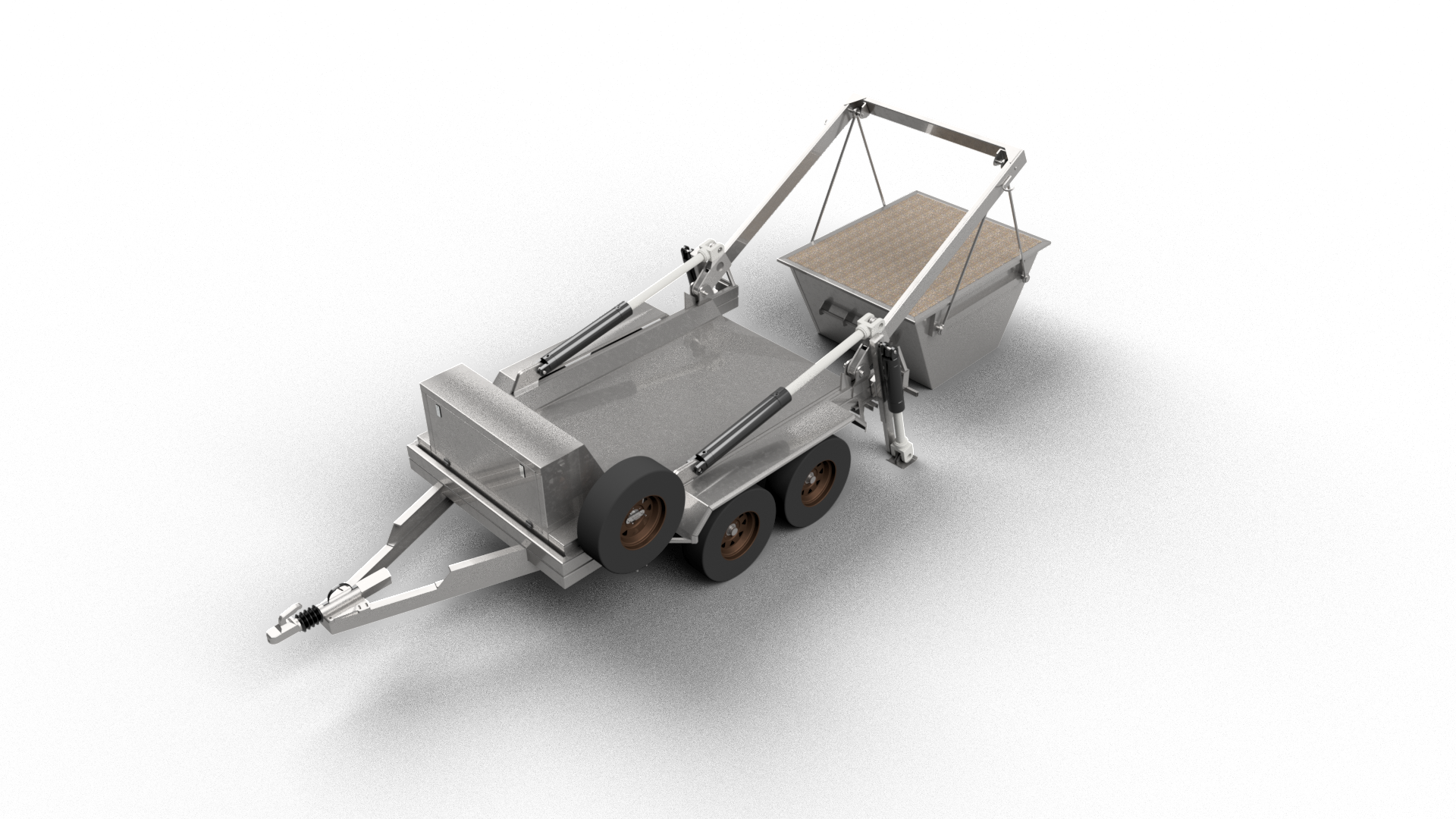 A skip trailer is a specialized heavy duty tow behind unit designed to carry open top bins (skips) loaded with demolition debris, landscaping waste or recyclable materials. For this 2.7m x 1.6m design, we started by defining the bin geometry in Autodesk Inventor: configuring a 1.52m³ payload volume, tapered sidewalls for easy discharge and a reinforced lip for crane or winch attachment. Once the bin sub assembly was complete, we modeled the twin axle chassis frame around SABS rated steel profiles, integrating pivot plates and hydraulic mounts to allow tilting and precise bin engagement.