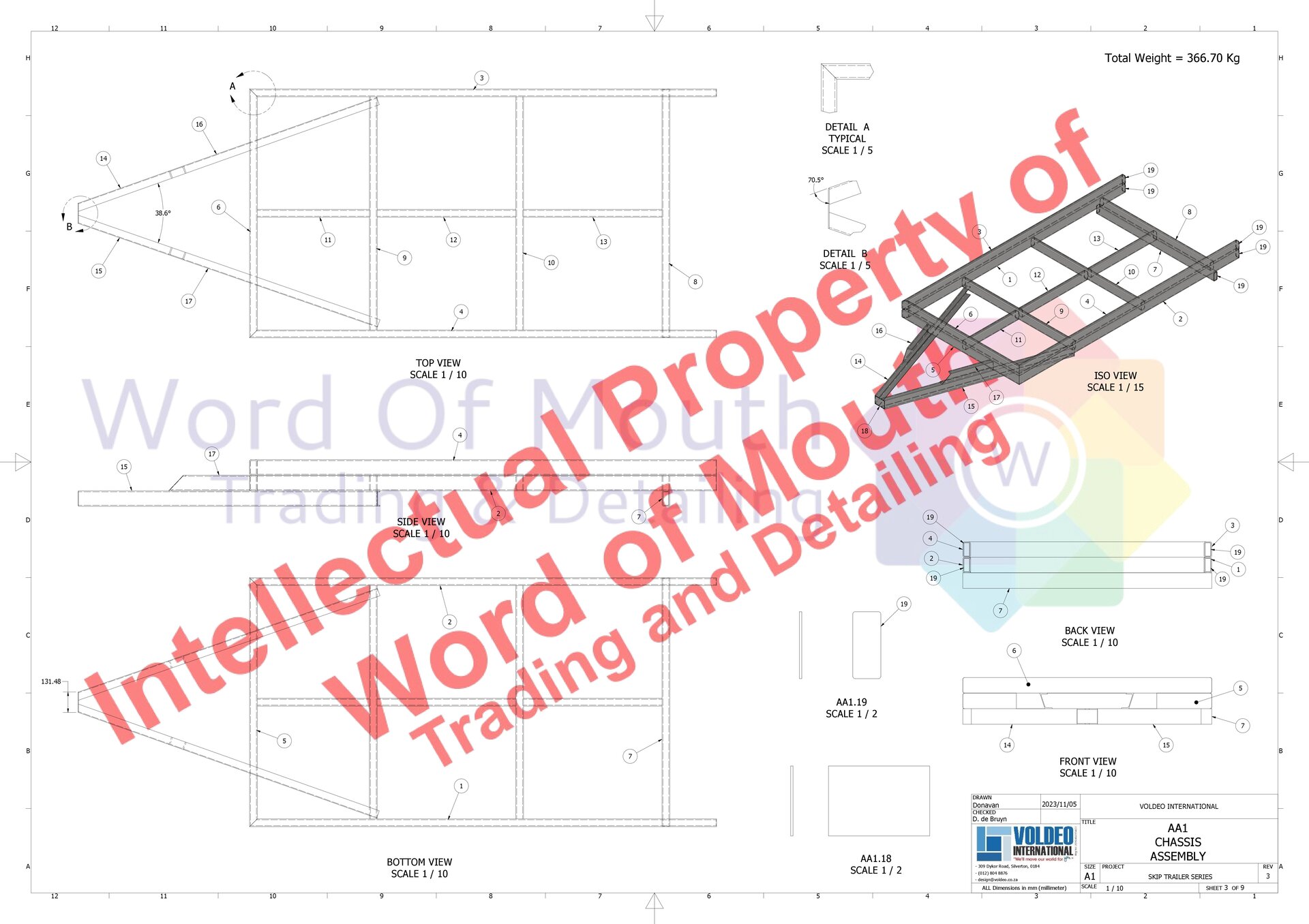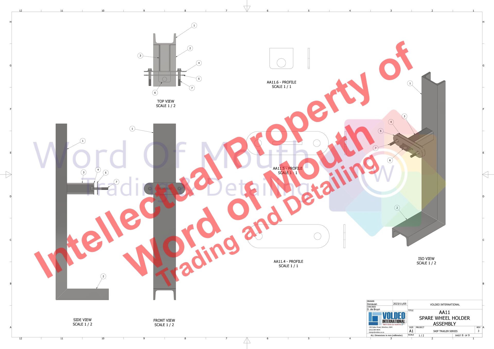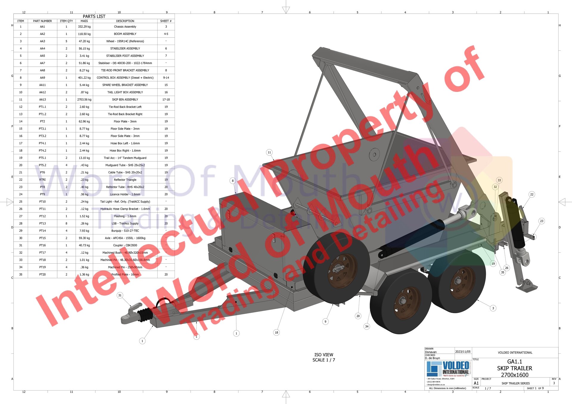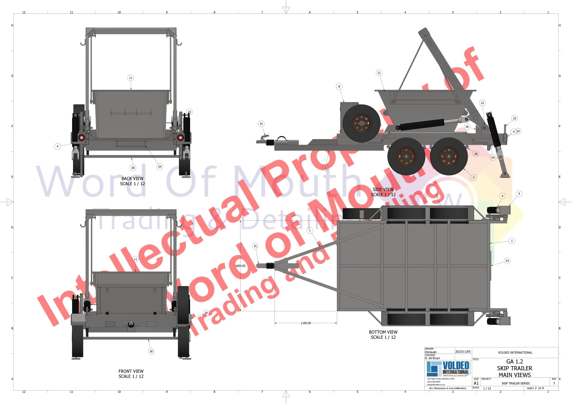 Finally, we generated a full suite of 2D fabrication drawings: exploded view callouts for hinge assemblies, section cuts of the bin to frame interface, and CNC ready DXF exports for laser profiling. Each drawing carried material specs, tolerance notes and weld sequence recommendations so the workshop could move directly from file to finished trailer without guesswork. The result is a turnkey skip trailer that balances strength, ease of use and rapid deployment for Voldeo Trailer’s toughest hauling jobs.