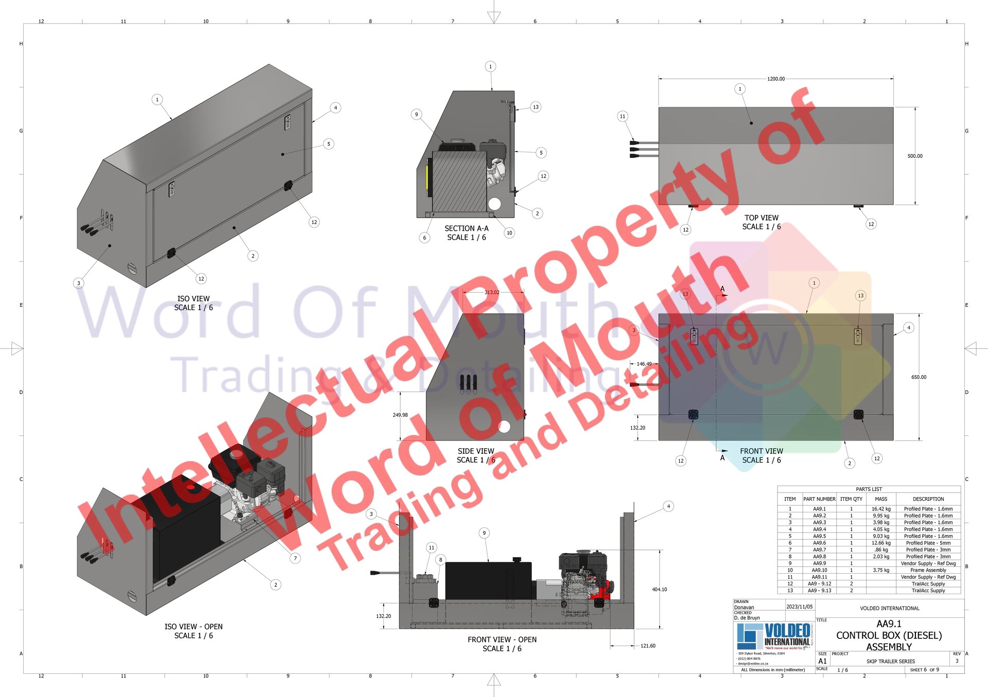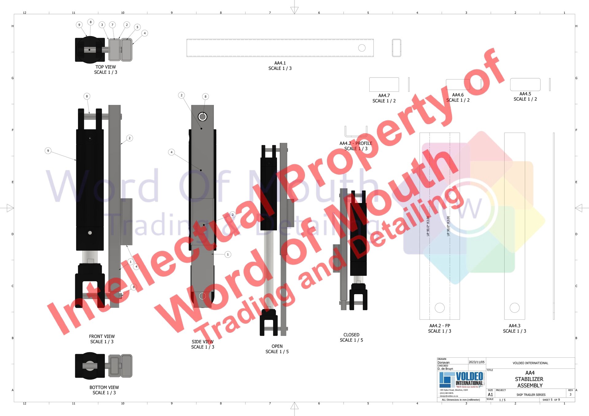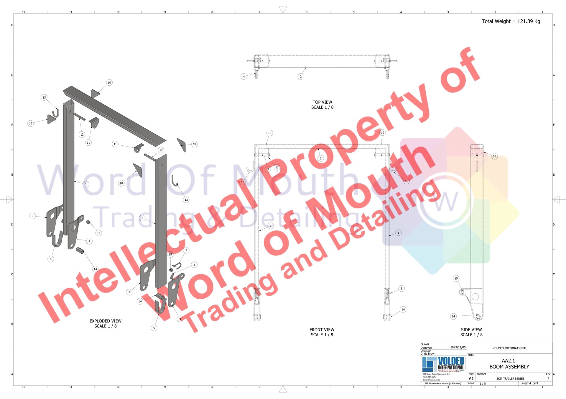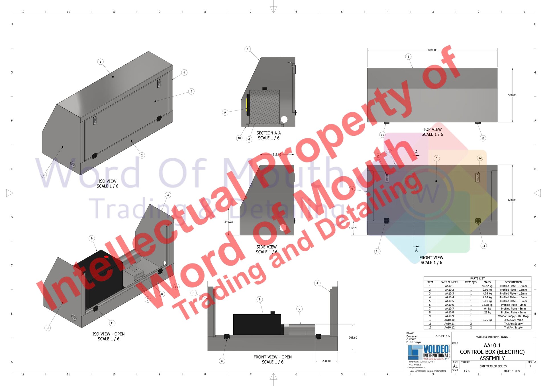Finally, we generated a full suite of 2D fabrication drawings: exploded view callouts for hinge assemblies, section cuts of the bin to frame interface, and CNC ready DXF exports for laser profiling. Each drawing carried material specs, tolerance notes and weld sequence recommendations so the workshop could move directly from file to finished trailer without guesswork. The result is a turnkey skip trailer that balances strength, ease of use and rapid deployment for Voldeo Trailer’s toughest hauling jobs.
